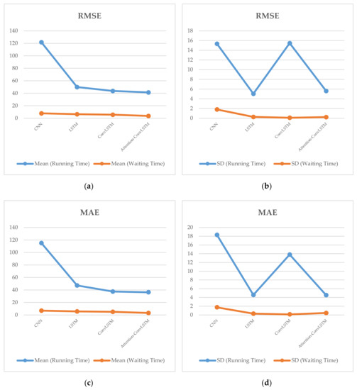 RMSE and MAE for the journey travel time prediction listed as: (a) The mean RMSE for the running time and waiting time; (b) The standard deviation of RMSE for the running time and waiting time; (c) The mean of MAE for running time and waiting time; (d) The standard deviation of MAE for the running time and waiting time.