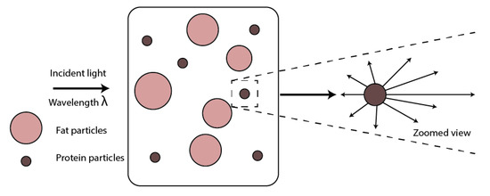 As is well known, the milk is a complex liquid composed of water (87%), fat (3.7%), protein (3.4%), lactose (4.8%) and other elements (0.7%), such as acid citric and minerals [5]. Then, the light–milk interaction will be governed by the relationship between the size of particles suspended and the wavelength of incident light [3,6,7,8]. Considering that the lipids have a diameter between 0.1 to 10 µm [7,9], and a casein protein has a diameter ranging from 50 to 680 nm [9], the milk–light interaction will be described by the Lorenz–Mie theory [10]. This considers the molecules involved as a spherical particle and the wavelength of incident light as smaller than the size of the molecules; this relationship is described by , where is the particle size, and is the wavelength of the incident light [11,12]. As a consequence, the scattered light by the milk contains information about these particles and can be used to determine the quality of the milk. It is important to mention that most of the scattered light goes in a forward direction (Figure 1). Besides, the milk usually has a temperature around 37 °C when it leaves the udder; then, the particles are slowly suspended and the Brownian motion is avoided [10].