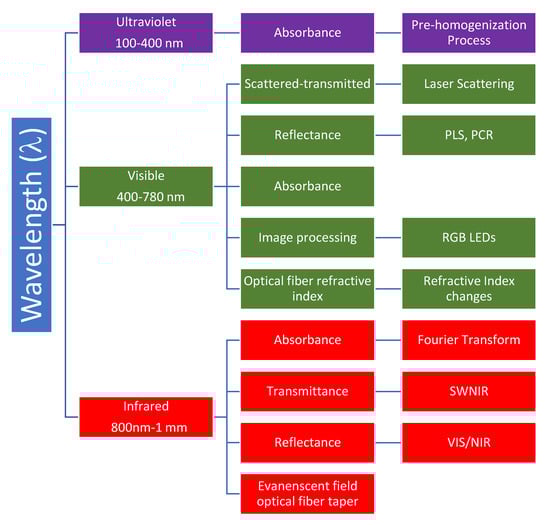 The light–milk interactions can be studied by spectroscopy, where the light interacts with the milk’s components; hence, several phenomena could be assessed [17]. In this paper, the possibility of determining the characteristics of the milk in a minimal amount of time in comparison with laboratory analyses is presented. To discuss the several milk analysis techniques, they are separated according to the light wavelength spectra operation from UV, VIS, and IR [17].