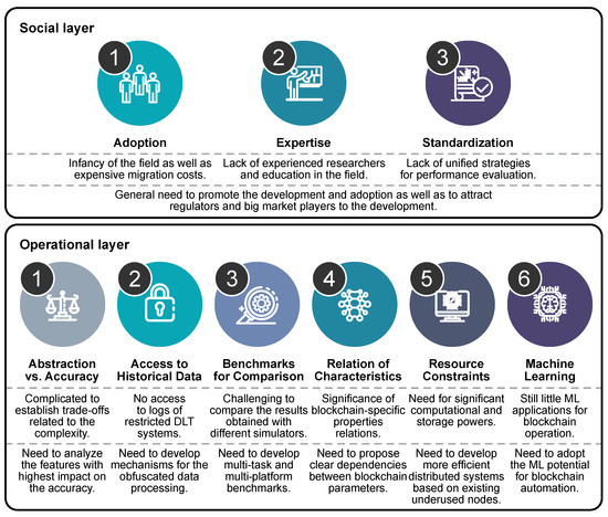 The models listed in Section 3 primarily focus on merely imitating and replicating the behavior of blockchain networks, while reducing the number of computational resources in contrast with the original blockchain implementations. Based on the analyzed literature, we identified two groups of challenges and prospects explicitly related to blockchain evaluation rather than to general blockchain operation; see Figure 2.
