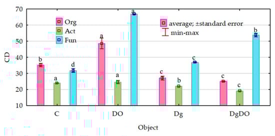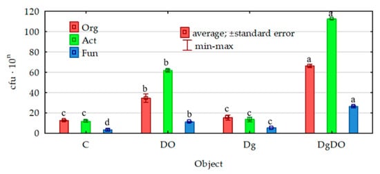 Effect of diesel oil (DO) and Dactylis glomerata (Dg) on the numbers of organotrophic bacteria and actinobacteria, 109 cfu kg−1 d.m. soil, and fungi, 107 cfu kg−1 d.m. soil. Homogeneous groups denoted with letters (a–d) were calculated separately for each of the microorganisms. C—non-polluted and non-sown soil, Dg—non-polluted soil sown with Dactylis glomerata, DO—non-sown soil polluted with diesel oil, DgDO—soil polluted with diesel oil and sown with Dactylis glomerata.