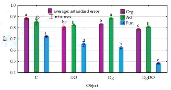 Effect of diesel oil (DO) and Dactylis glomerata (Dg) on the ecophysiological diversity index (EP) of the microorganisms. Homogeneous groups denoted with letters (a–c) were calculated separately for each of the microorganisms. C—non-polluted and non-sown soil, Dg—non-polluted soil sown with Dactylis glomerata, DO—non-sown soil polluted with diesel oil, DgDO—soil polluted with diesel oil and sown with Dactylis glomerata.