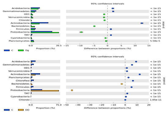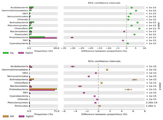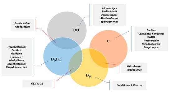 The relative abundance of the dominant bacterial type in the soil with a difference between proportions ≥ 1%. C—non-polluted and non-sown soil, Dg—non-polluted soil sown with Dactylis glomerata, DO—non-sown soil polluted with diesel oil, DgDO—soil polluted with diesel oil and sown with Dactylis glomerata.
