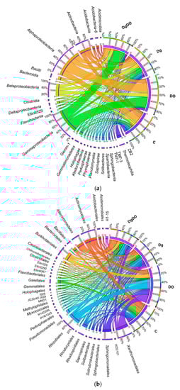 The relative abundance of the dominance class (a) and order (b) of bacteria in soil with a difference between proportions ≥1%. C—non-polluted and non-sown soil, Dg—non-polluted soil sown with Dactylis glomerata, DO—non-sown soil polluted with diesel oil, DgDO—soil polluted with diesel oil and sown with Dactylis glomerata.