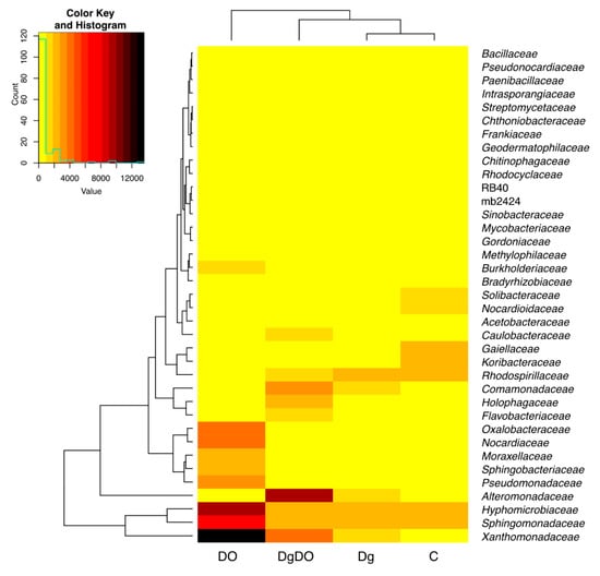 Heat map and relationships of the operational taxonomic unit (OTU) numbers of 37 bacterial families in the soil with a difference between proportions ≥1%. C—non-polluted and non-sown soil, Dg—non-polluted soil sown with Dactylis glomerata, DO—non-sown soil polluted with diesel oil, DgDO—soil polluted with diesel oil and sown with Dactylis glomerata.