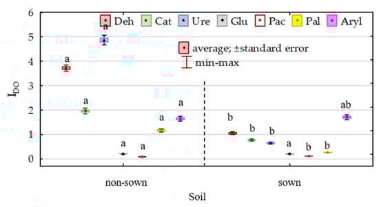 Index of the effect of diesel (IDO) on soil enzyme activity. Homogeneous groups denoted with letters (a,b) were calculated separately for each enzyme.