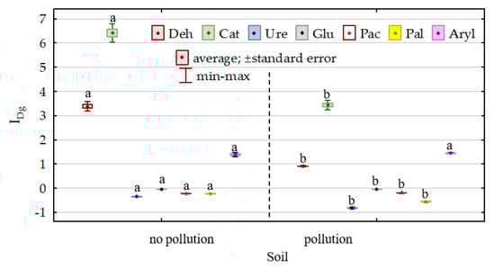 Index of the effect of Dactylis glomerata (IDg) on soil enzyme activity. Homogeneous groups denoted with letters (a,b) were calculated separately for each enzyme.