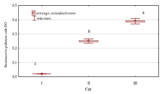 Diesel oil added to the soil significantly impaired the growth and development of Dactylis glomerata (Figure 10). It had an especially adverse effect at the initial stage of orchard grass growth, as shown by a very low value of the index of its resistance (RS = 0.02) to soil pollution. With time, Dactylis glomerata was observed to better adapt to the adverse conditions. The index of its resistance (RS) to soil pollution with DO increased successively from 0.02 (cut I) to 0.39 (regrowth III).