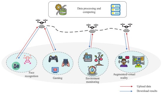 Figure 1. The ground users upload the data, such as the face regonition data, gaming data, environment monitoring data, augmented/virtual reality data, and so on, in order to the UAV. After the UAV receiving the data from the ground users, it starts to process and compute the data. Subsequently, the UAV downloads the compuing results, such as the results of identification, rendering and stitching of video streams, environment analysis, and so on, to the ground users.
