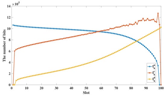 Figure 3a. It can be seen that the amount of uploading bits decreases along with time for the proposed scheme. In contrast, the number of computing bits and downloading bits increase along with time. The phenomenon is because of the data causality, which means that the UAV can only process the tasks when the ground users finish the transmission of data and the computing results can only be transmitted to the ground users when the UAV complete data processing. What is more, to finish the offloading services in time, the number of computing bits and downloading bits exceed the number of uploading bits gradually. In addition, the number of downloading bits is relatively low because