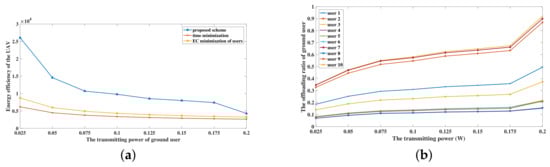 Figure 5b, it is obviously observed that the offloading ratio of each user grows when the transmitting power increases by using the proposed scheme. Likewise, it can be deduced that the offloading ratio of ground users with the other two benchmark schemes also increase when the transmitting power grows. As the offloading ratio grows, the number of uploading bits increases and the computing burden is aggravated. Subsequently, the higher computing energy consumption is caused by the higher computing burden. Besides, the energy efficiency of the UAV is decreased because the energy consumption of the UAV has a more obvious effect than the number of input bits on the energy efficiency of the UAV. Hence, when the transmitting power is growing, the energy efficiency using three schemes is decreasing. Besides, it can be inferred that, when the transmitting power grows, the computation burden of ground users decreases because of the growth of the offloading ratio.