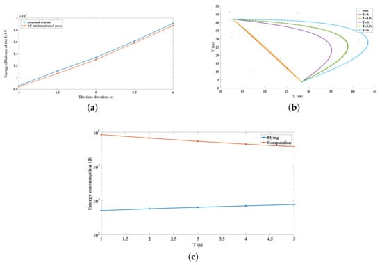 Figure 6b. Besides, when the time constraint is urgent, the UAV has to complete the offloading tasks under the limited time duration and the computing burden is increased. Subsequently, the energy consumption of computing is increased, which causes the deterioration of the energy efficiency of the UAV. Even though the propulsion energy consumption increases because of the longer flight distance along with the growth of