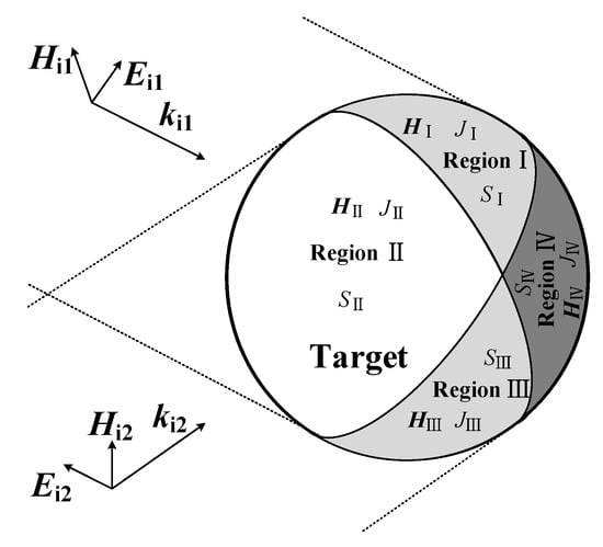 With the development of electronic devices and radar systems, the electromagnetic (EM) environment becomes more increasingly complex than ever before [,,]. In complex and various EM environments, the analysis of scattering problems, the improvement of radar systems and the recognition of hidden targets have become frontier science in recent years [,,,], including electronic countermeasures, electronic support and so on [,]. When solving scattering problems, the investigation of the scattering properties is regarded as one of the most important aspects [,,]. Especially in complex EM environments, the scattering properties will be affected by the incidence of multi-radiators []. Hence, the investigation of target scattering properties in complex EM environments has been established as of great value both for military and civil employments [,].