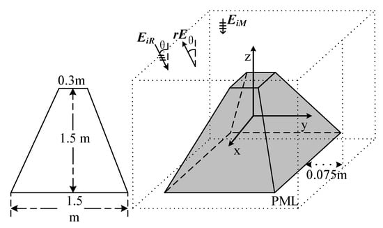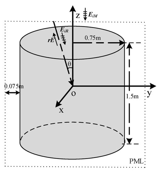 As shown in Figure 6, the incidence wave is a plane wave with a maximum frequency of 1 GHz and wavelength () of 0.3 m. The wave in the xOz plane incidents along the negative side of the z-direction. The polarization direction is along the y-direction. In this calculation, is chosen to validate the uniformity. is the scatted field by the target. The metal cylinder structure has a radius of 0.75 m (2.5) and a height of (5). The metal material can be simulated by employing the perfect E conductor (PEC). The perfectly matched layer (PML) is employed at boundaries. The distances between the object and the boundaries are 0.075 m. In this simulation, is observed for further calculation.