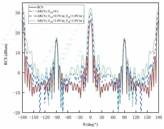 Figure 7 shows the RCS and ARCS versus different angles and external disturbances of the metal cylinder structure. It can be observed that the curves are almost overlapped when , indicating that the ARCS with the single incident wave holds the same accuracy as RCS. The maximum values are 26.32 dBsm and 16.28 dBsm, with the angles of 0° and 90°, respectively. The reason is that mirror reflection plays an important role among the backward scattering when EM waves incident vertically to the structure. The error between the RCS and ARCS is 0.1 dBsm when the angle is 90°. With the whole angles band, the average error between ARCS and RCS is 0.07 dBsm. Thus, the ARCS and RCS show considerable uniformity. Meanwhile, ARCS increases with the increment of . The most obvious situations can be found at 0. The ARCS are 26.34 dBsm, 29.78 dBsm and 32.28 dBsm with of 0 V/m, 0.5 V/m and 1 V/m, respectively.