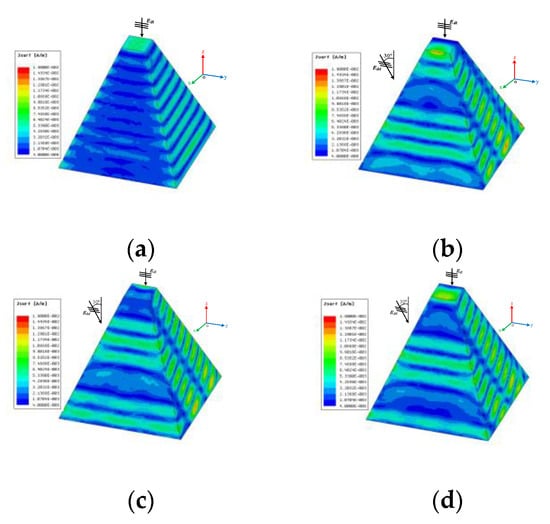 As shown in Figure 9, when the object is incident by the radar wave and the multi-radiators, the surface-induced current of the metal prismoid model is different compared with a single radar wave. The radar wave is incident along the z-axis. The multi-radiator wave from 30° is with the same power and polarization direction with the incident wave. Figure 9a shows the current distribution of the surface of metal prismoid with the incidence of the radar wave. Figure 9b shows the surface current distribution of the surface of the metal prismoid model with the incidence of both the radar wave and the multi-radiator wave. The phase difference between the radar wave and multi-radiator wave is 0°. Figure 9c shows the surface-induced current distribution of the surface of the metal prismoid model with a different phase angle of 180°. Figure 9d shows the surface-induced current distribution of the surface of the metal prismoid model with a different phase angle of 90°.