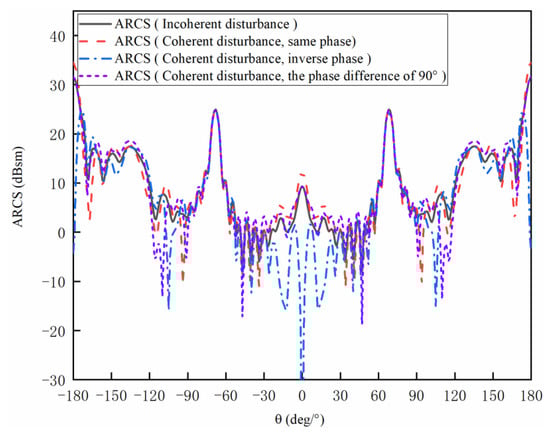 Comparing the coherent external disturbances at the inverse phase with the incoherent external disturbances, it can be calculated that the ARCS of coherent external disturbance is 319.32 dBsm lower than that of the incoherent external disturbance at 0°. From 110° to 175°, the curves are almost overlapped. At the other angles, a large calculation difference can be observed.