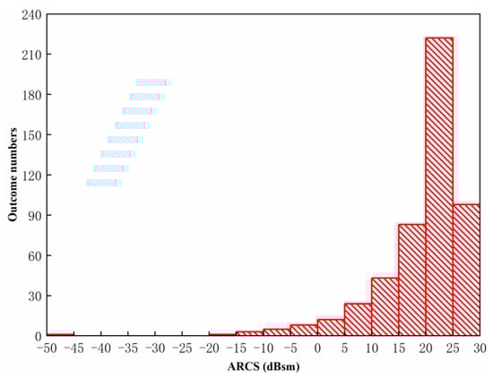 Figure 14 shows the statistical characteristics of ARCS obtained by the uniform distribution multi-radiators with 500 times random simulation. The ARCS range, the outcome frequencies and the outcome rate are shown in Table 1. It can be observed from Table 1 and Figure 14 that the maximum outcome of ARCS has a number of 222 and a proportion of 44.40%, which occurred between 20 dBsm to 25 dBsm. It concluded that the outcomes of ARCS improve with the increment of ARCS value from −50 dBsm to 25 dBsm. Ranging from 15 dBsm to 30 dBsm, the ARCS outcomes are with the most proportion of 80.60%.