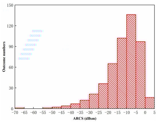 It can be established that most values are concentrated near the average point . Thus, the probability of the phase with the value of can be calculated as 99.74%. The statistic characteristics of ARCS obtained by the Gaussian distribution are shown in Figure 16. As shown, the distribution of ARCS follows Gaussian distribution. Table 2 shows the ARCS range, the outcome frequencies and the outcome rate at the Gaussian distribution. As shown from Figure 16 and Table 2, the outcome rates of ARCS with the range from −20 dBsm to −10 dBsm and −10 dBsm to 0 dBsm are 33.40% and 46.60%, respectively. The outcome numbers under the multi-radiator phase with Gaussian distribution decreases with the decrement of ARCS. As is concluded from both Figure 16 and Table 2, the outcome numbers account for 80.00%, with the ARCS from −20 dBsm to 0 dBsm.