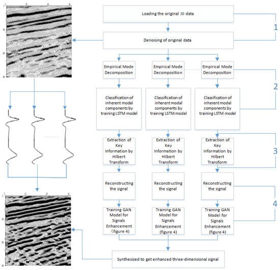 The weak signal data and the processing flow of the algorithm bring great challenges in the weak signal enhancement method proposed in our paper. In this section, the first step is to pre-process the original weak signal. The second step is to use the complementary set empirical mode decomposition method to decompose the pre-processed signal and obtain the intrinsic modal component. In the third step, the LSTM model is trained by correlation computation to select the effective intrinsic modal components adaptively, and the instantaneous amplitude and phase of the instantaneous frequency are obtained by the Hilbert transform. In the fourth step, we reconstruct the instantaneous phase and amplitude to recover the weak signal without enhancement. Finally, the GAN model was trained to generate enhanced weak high-definition signals. Figure 1 shows the flow chart of our method. We used the three-dimensional seismic data [20] as the input signal. The three-dimensional seismic signal is the three-dimensional spatial data obtained from the propagation route and time of the artificially excited seismic wave in the underground strata [21,22].