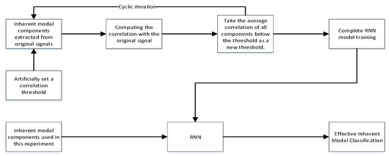 Then the above two formulas can be used to derive the correlation between the spurious component and the pre-decomposition signal. The above formula shows that the correlation between the decomposed intrinsic modal component and the original signal depends on the auto-correlation of each component’s autocorrelation. The correlation between the pseudo-component and the original signal is approximately zero. According to the non-directionality of random noise, the correlation between the components of the random noise and the original signal is low and approaches 0. Based on the above inference, we can make a provision. The correlation is judged R ≥ 0.02, and if it is greater than or equal to 0.02, it is recorded as an effective intrinsic modal component, and the self-adaptive selection is determined as the target of the next step by judging the correlation. However, through actual testing, it is found that the artificial correlation threshold will lead to incomplete classification and cannot be perfectly screened out all the effective intrinsic modal components. In order to screen out as many effective components as possible, we train an LSTM model here to continuously optimize the correlation threshold to enhance the classification effect [26].
