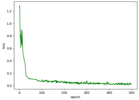 The LSTM model used in this paper contains two LSTM layers, a dropout layer with p = 0.2, a fully connected and a sigmoid layer. The LSTM gets 32 hidden units and the loss function is the log likelihood function. We also used the Adam optimizer to train the network. The learning rate was 0.01, which was attenuated by the natural index, the batch size was 20, and the number of the epoch was 500. The change of loss value of the model is shown in Figure 7. When the model was trained 400 times, it basically converged, and the final loss value was around 0.015.