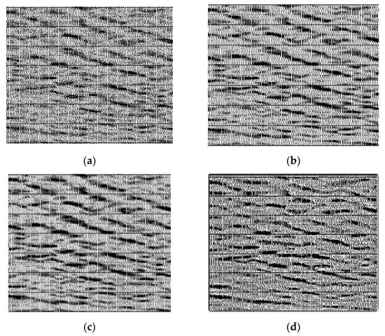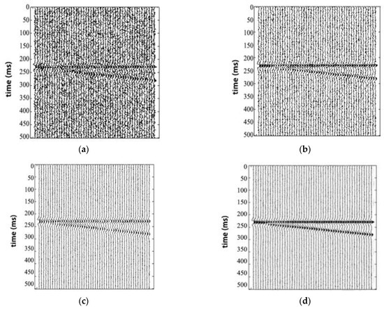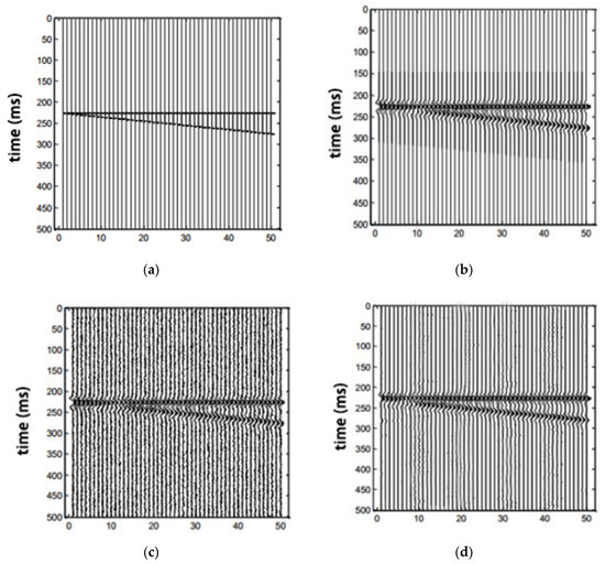 In order to detect the efficiency of our approach, we tested some simulated 3D seismic data. In our synthetic 3D seismic data, in the horizontal direction, each dataset has 50 seismic traces, each trace has 500 seismic sampling points, the plane in the horizontal direction is shown in Figure 9. We use the x-axis to represent the amount of analog 3D seismic data channels, and the y-axis is the vertical sampling points of analog 3D seismic data. Figure 9a shows the profile formed by the first line, which consists of a horizontal and a slanting reflection axis. Figure 9b is the profile of the first line after convolution of the reflection axis and the Ricker wavelet in the whole data. Figure 9c is a profile of the first line after Gaussian white noise is added to the whole synthetic data volume. Figure 9d is a profile of the first sideline of the synthesized 3D data processed by our method.