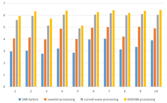The comparison results are shown in Figure 11. In Figure 11, the y-axis represents the SNR, and the x-axis represents the 10 data lines processed by the composite data. The result shows that the SNR of EMDNN processed is higher than others in the background of strong noise. The simulation results show that the 3D data processed by this method can clearly identify the wedge-shaped geology, which shows that EMDNN method not only improves the SNR but also increases the resolution.