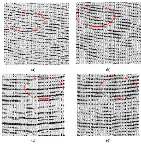 Next, we conducted experiments on the actual weak reflection 3D data. The actual three-dimensional seismic data that we took were the weak seismic signal hidden in the background of strong noise. There were 1160 lines in the data, 1040 for each line, 6000 ms for each seismic signal and 1ms for sampling interval. We processed the whole three-dimensional seismic data, and then observed the profile of a survey line, and took the profile with weak reflection seismic signal, which contained 100 channels of 600 sampling points. The effect comparison before and after processing is shown in Figure 12 (the red rectangle represents the most distinct area before and after processing). Figure 12a is the unprocessed figure of the profile of the sideline, and Figure 12b is the figure that has been recovered by the wavelet transform. Figure 12c is a graph that has been recovered by curved wave transformation. Figure 12d is the graph that has been recovered by this method. Figure 12 shows that the pre-processing signal cannot be recognized at all. After wavelet and curve transform processing, compared with the original signal, some weak signals were recovered obviously, but some of the same direction axes were still difficult to distinguish. As a result, the effect of the data processed by our method was obviously improved, and the weak signal was clearly reflected. Figure 13a,c were unprocessed figures of the sections of different sidings, and Figure 13b,d were the figures intercepted after the processing by our method. It shows that the geological horizon processed by our method was clearer.