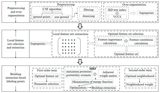 The proposed method is carried out according to a hierarchical process, the workflow is shown in Figure 1. The LiDAR point clouds were firstly identified as ground and off-ground points using an existing ground filtering algorithm [22] to eliminate the connectivity between different objects. And then, outlier and noise filtering are performed in off-ground points. The further process consists of three main steps: