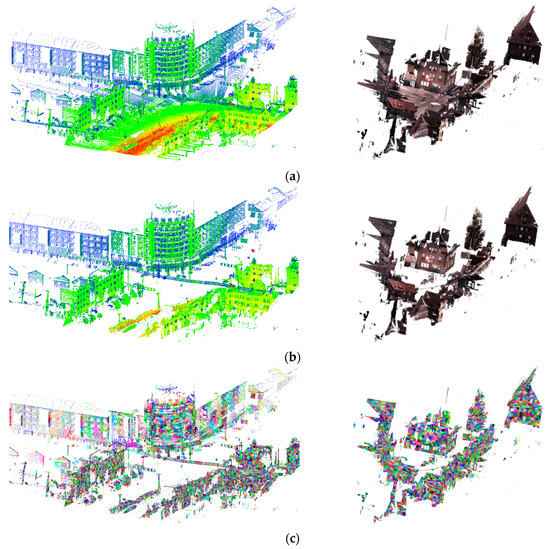 Super-points generated from own (left) and benchmark (right) datasets. (a) Raw data, (b) raw data without ground, (c) super-points results generated by our method.