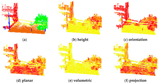 Different feature distribution. (a) Point cloud with label, (b–f) the value distribution of each feature in the area with color-coded feature values, where yellow represents a low and red a high value.