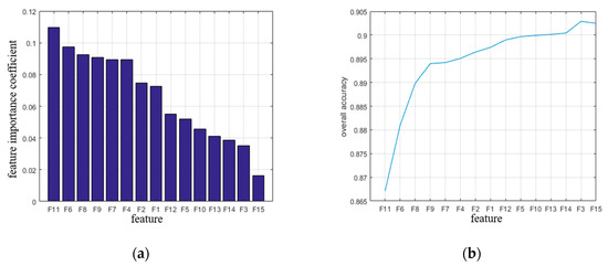 Figure 4a,b are the importance ranking of features and the effect of feature selection on classification accuracy, respectively. It can be found that F14 (horizontal projection feature ), F3 (feature value ) and F15 (minimum vertical projection feature ) have the least importance, for this reason, we assume the three worst-ranked feature of importance metric to be pointless in the experiments. Following the principle of forward selection, we begin with only the most importance feature. Subsequently, the derived order of the features is used to successively train and test the classifiers with one additional feature per iteration. As shown in Figure 4b, the classification accuracy reaches the highest precision value of 0.903 after adding the feature (F3) while the accuracy decreases after adding the feature, indicating that the feature has an impact on the classification accuracy and can be deleted.