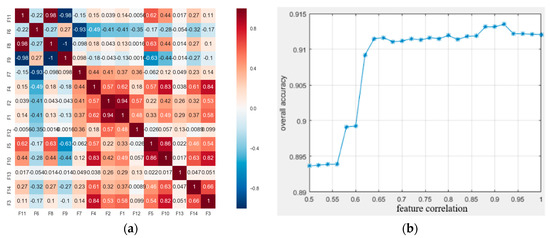 Relationship between feature correlation selection and classification accuracy. (a) Feature correlation heat map; (b) relationship between feature correlation and accuracy.