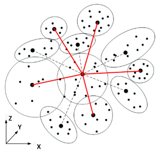 In order to solve the problem of classification optimization error propagation, the similarity relationship among clusters is calculated and clusters with high similarity are selected to construct a local optimal neighborhood system, as shown in Figure 6 (The red line connection constitutes the optimal neighborhood system, indicating the point cluster with higher similarity; dotted line connects the dissimilar point clusters need to be deleted from the neighborhood during the construction process). The proposed method is based on the obtained optimal local feature set, and then selects from K-nearest neighbors the clusters whose correlation satisfies the threshold p < 0.70 to construct an optimal neighborhood system.