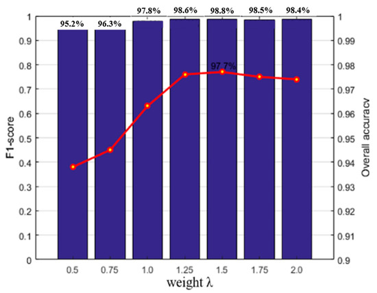 In order to choose the optimal weight λ which is the coefficient of equilibrium data term and smooth data, we analyzed the impact of λ on the performance of labeling on Dataset A. The weights λ are set to 0.5, 0.75, 1.0, 1.25, 1.5, 1.75 and 2, respectively. As shown in Figure 7, the initial labeling results of buildings improves with the changes of the parameter λ. When the smoothing factor reaches 1.25, the F1-measure of the building tends to be stable, and the classification accuracy peak value reaches at λ = 1.5. Larger weight value means more costs imposed on the number of used categories, however, may lead to over-smooth results for labeling point clouds. Whereas a smaller λ means less penalty for the number of categories used in the region, which will result in a relatively large quantity of incorrect labels that cannot be effectively corrected. Properly setting the smoothing term coefficient to 1.5 can achieve balance and get the highest building classification accuracy, thereby obtaining promising fine labeling results.