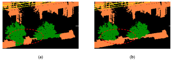 The initial label is adjusted by the α-expansion algorithm [37], which mainly merges the wrong categories into the majority of the surrounding classes, thereby reducing the inconsistency of the local classification. The minimum energy function was solved by a graph cut algorithm to obtain optimized classification result. Then in order to compare the effects of the optimized neighborhood system, this paper also works under the ordinary neighborhood system and compares the two classification results, as shown in Figure 8. It is easy to find that the result based on K-nearest neighbors (as shown in Figure 8a) show that neighboring objects can easily cause error propagation in the occlusion area due to the method only considers the spatial distance and ignores the similarity between different types of objects. Because the optimized neighborhood system considers the similarity of local clusters, the classification results, can effectively avoid the propagation of the optimization errors at intersections.