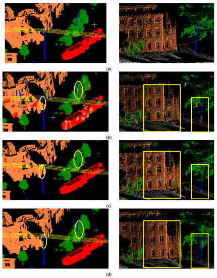 During the learning phase, manually labeled points are used as input to train the RF classifier at each iteration. The number of decision trees and the depth of each tree in the RF are set at 100 and 15, respectively. The initial scene semantic labeling and the comparison with the spatially smoothed results of buildings (rendered with yellow color) for selected point clouds test data are shown in Figure 9. Figure 9a show the ground truths and are colored according to the labels of each point. Illustration of the initial semantic segmentation results of candidate objects are provided in Figure 9b, a small part of which are mislabeled points caused by local feature similarities, e.g., generally incomplete building façade incorrectly identified as trees. Figure 9 show the results of MRF classification optimization based on ordinary K-nearest neighbors. In Figure 9d, the spatially smoothed results of MRF classification based on optimized neighborhood are given.