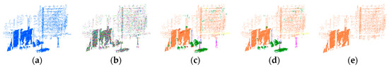 The illustration of building extraction of the purposed method. (a) Raw data; (b) super-points of non-ground points; (c) the initial results of semantic segmentation; (d) the final results of semantic segmentation; (e) the results of building extraction.