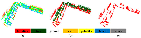 To check the performance of the presented framework on LiDAR point clouds, we performed both qualitative and quantitative evaluations on three different data sets. The point clouds in dataset A are part of the urban scene in Hengdian, Zhejiang, China, collected through the SSW-MMTS mobile mapping system. As described in [13,38], the SSW-MMTS mobile mapping system integrates a laser scanner with a maximum range of 300 m, a navigation and positioning system, and six high-resolution digital cameras (22 million pixels each), installed on the roof of a minivan. The point density of the points in this area is about 77 points/m2. Dataset B was captured around urban and rural outdoor scenes in Zurich, Switzerland with 30 static terrestrial laser scanners, [21,39] explains the large-scale 3D outdoor benchmark datasets, having point number about 600 million 3D points with different densities and colorizing from camera image. Dataset C [40] is a total of about 8 million points acquired around Wuhan University campus in Wuhan, Hubei, China using SICK LMS291 Laser Scanner; the dataset has a low point density and belongs to a low-resolution laser scanning data. The collected point clouds of dataset C without color information due to lack of digital cameras and the amount of points is quite smaller than those in dataset A and B. In the above three different datasets, many objects are often incomplete due to mutual occlusion, which is extremely challenging. Our team and other collaborators carefully classified all points with the CloudCompare (http://www.cloudcompare.org/) tool to evaluate the performance of the proposed framework. All datasets are divided into training samples for learning procedure and testing samples for the evaluating the performance of the proposed methods.