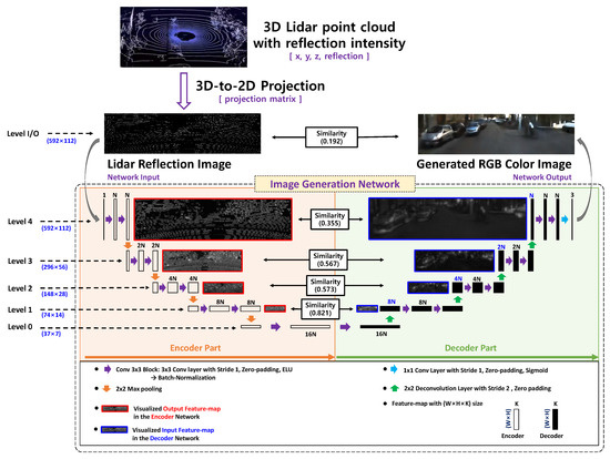 As shown in Figure 2, the input reflection intensity and output color images have completely different visual characteristics. The encoder and decoder feature maps at higher levels have characteristics similar to those of the reflection intensity and camera image, respectively. On the contrary, the feature maps of the encoder and the decoder have more common characteristics for a lower level. To verify the properties, the similarity [24,25] between representative feature maps at the level L is measured as follows: