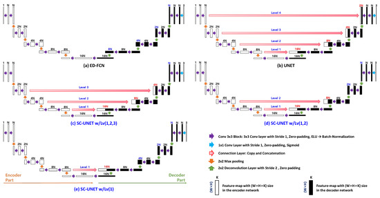 In summary, it is necessary to concatenate multiple levels in the sense of the amount of transferred information and it is desirable to concatenate feature maps at the low levels. Accordingly, we propose architectures, called SC-UNETs with w/Lv(1), w/Lv(1,2) and w/Lv(1,2,3).