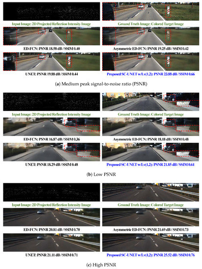 The validity of the selected connections in the UNET structure was investigated for camera-like RGB color image generation from the sparse 2D LiDAR reflection image. The three proposed architectures, such as SC-UNET w/Lv(1,2,3), w/Lv(1,2) and w/Lv(1), as shown in Figure 3c–e, were evaluated in this simulation. Two conventional networks, ED-FCN and UNET, were used for the performance comparison. To determine the performance variations with respect to the number of filters N in convolution layer, we conducted experiments for 16, 32, 48, and 64. As previously mentioned in Section 3.1, five-fold cross validation was applied in all the experiments. The PSNR, SSIM, and their corresponding standard deviations are summarized in Table 2. For the evaluation of computational complexity, the number of weights in the network and the processing time measured in millisecond per frame were analyzed. To analyze the effect of single layer connection in the proposed architecture, the simulation results for connections of SC-UNET w/Lv(1), w/Lv(2), w/Lv(3), and w/Lv(4) were also summarized. For comparison with our previous work [12], all methods were also tested on the same dataset used in [12] and the performance of asymmetric ED-FCN [12] is listed in Table 2.