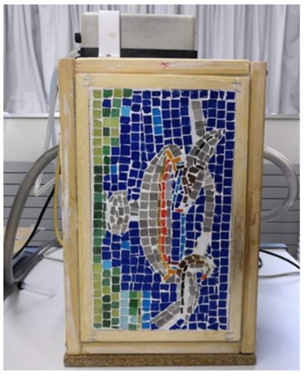 The first supporting sub-mosaic layer is natural mortar with the insertion of clay-brick pieces which is located in the layer at the lower side of the wooden frame (i.e., on the opposite side of the front surface of Figure 1). As for the intermediate layer, four artefacts are placed and covered by slurry, being only two of them analysed in this work. The first artefact under study is a transparent silicone duct passing through the sample which allows the continuous flow of water recirculated from a small tank placed at the bottom back of the mosaic and thanks to a water pump (hereinafter, the artefact is referred to as water_pipe). The water pump is placed just inside the tank, recirculating water with a constant flow rate of 420 L/h. The second artefact is a plastic sponge in contact with a silicone duct passing through only one lateral side of the wooden frame, inserting a known amount of water in the duct using a graduated syringe. The inserted water reaches the sponge with a flow rate equal to 18 L/h (hereinafter, the artefact is referred to as water_sponge).