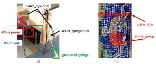 (a) Water tank, water pump, graduated syringe, water_pipe and water_sponge ducts positions; (b) water_pipe and water_sponge locations from the front surface of the mosaic.