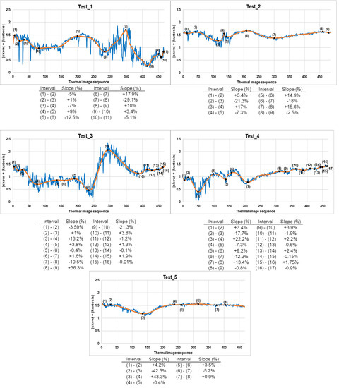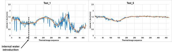 As an example, Figure 5 shows the corresponding evolutions of the skew and kurtosis summation in Test_1 (introducing internal water, at the instant corresponding to the thermal image 120 indicated by means of a discontinuous vertical line) and Test_5 (without internal water) before and after the SG smoothing filter application. Moreover, Figure 6 shows the resulting relative maximums/minimums and slopes, in %, of each test used as input data in this work.
