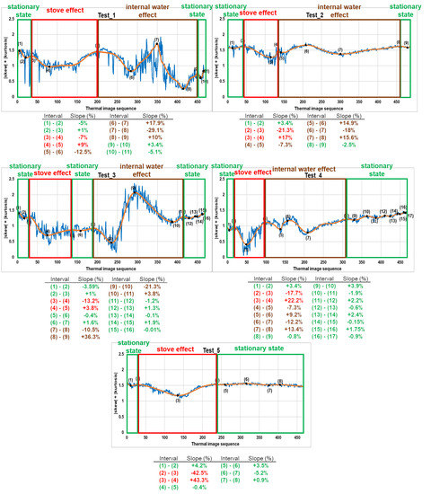 Test_5 is used for the differentiation between the stove effect and the internal water effect, i.e., the “green” and “blue” bars of Figure 9, respectively, since in that test the internal water is not introduced in the sample. In the graph of Test_5, there are not four consecutive slopes with an absolute percentage value higher than 4.9%, i.e., there is no w_shape. Therefore, in the case of having four consecutive slopes with absolute percentage values higher than 4.9%, it can be stated that the thermal footprint of an internal water is affecting the surface of the material under study. Therefore, the reference_point is the instant immediately after the starting point of the first of the consecutive slopes. In the case of five or six consecutive slopes with an absolute percentage value higher than 4.9%, the last four belong to the w_shape, since the effect of the internal water is superimposed to the stove effect as explained at the end in Section 3.1.
