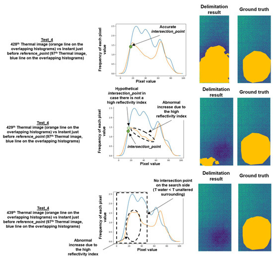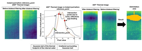 Figure 8 shows the leftmost intersection point as the intersection_point in the overlapping histograms, since the temperature of the volume of internal water is colder than the temperature of the rest of the sample. The same happens to the rest of images of the Test_1, and also to the remaining sequences of this work (see ambient and water temperatures shown in Table 2). The knowledge of the intersection_point makes possible the delimitation of the contour of the thermal footprint of the internal water. In Figure 8, the area of the delimitation is highlighted in orange.