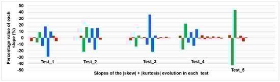 Then, the automatic computation of the slopes is performed by: (i) The automatic search for the relative maximum and minimum values in the resulting evolution of the sum of skew and kurtosis after the SG smoothing filter application by the find_peaks function [38], (ii) the automatic calculation of the numerical value of the slope between each two consecutive extremes obtained in (i) (, being and the difference between the values of two consecutive extremes and between the positions of those extremes, respectively), and (iii) the automatic calculation of the percentage value of the slope between each two consecutive extremes (, being the numerical value of the slope i obtained in (ii), and the sum of all the numerical values of the slopes of the evolution obtained in (ii) in absolute terms).