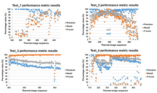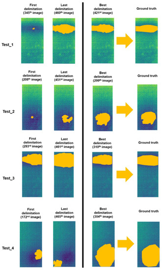 Figure 10 shows different graphs, each corresponding to a different test, representing the corresponding Precision, Recall and F-score values obtained. In addition, with the aim at illustrating the values represented in the graphs of Figure 10, Figure 11 shows the first and the last delimitation obtained from each test, being the delimitation areas highlighted in orange on the corresponding raw thermal images. To illustrate how good the results obtained are according to the analysis in Step 2, Figure 11 also represents the best delimitation according to the F-score results together with the corresponding ground truth of each test (also highlighting the delimitation areas in orange).